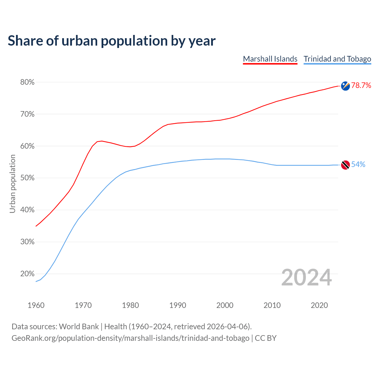 From 2004 to 2024, the share of urban population changed from 70.1% to 78.7% in the Marshall Islands and from 55.6% to 54% in Trinidad and Tobago.