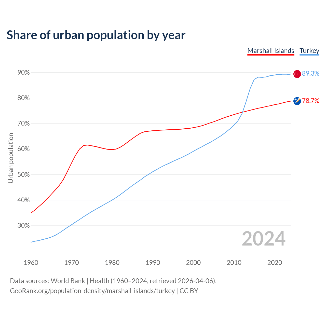 From 2004 to 2024, the share of urban population changed from 70.1% to 78.7% in the Marshall Islands and from 62.4% to 89.3% in Turkey.