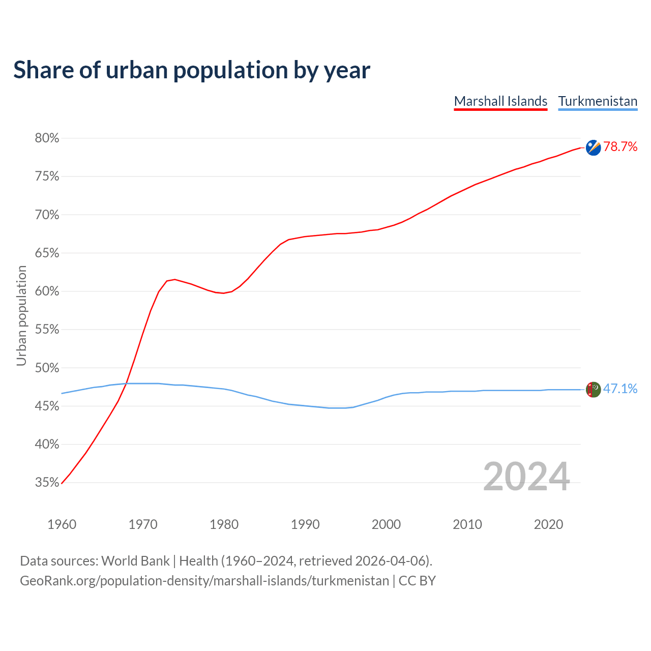 From 2004 to 2024, the share of urban population changed from 70.1% to 78.7% in the Marshall Islands and from 46.7% to 47.1% in Turkmenistan.
