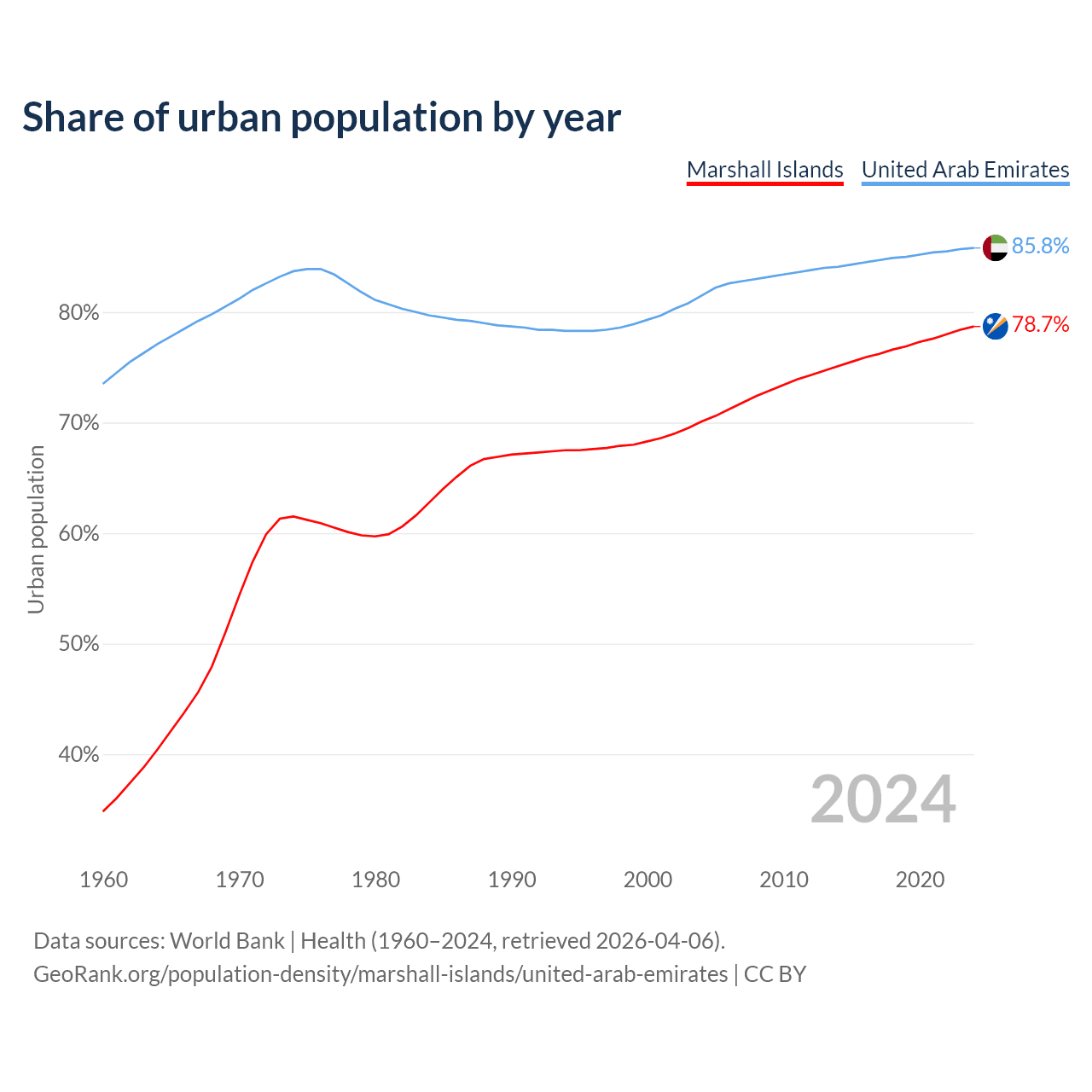 From 2004 to 2024, the share of urban population changed from 70.1% to 78.7% in the Marshall Islands and from 81.5% to 85.8% in the United Arab Emirates.