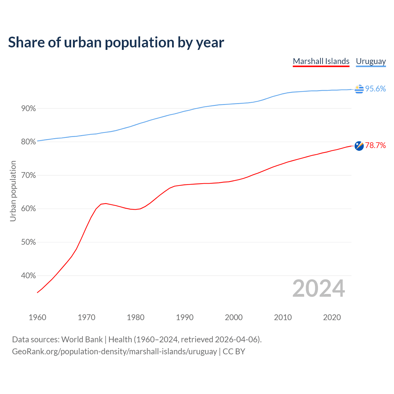From 2004 to 2024, the share of urban population changed from 70.1% to 78.7% in the Marshall Islands and from 91.8% to 95.6% in Uruguay.