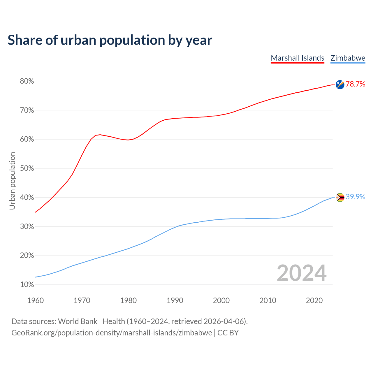 From 2004 to 2024, the share of urban population changed from 70.1% to 78.7% in the Marshall Islands and from 32.6% to 39.9% in Zimbabwe.