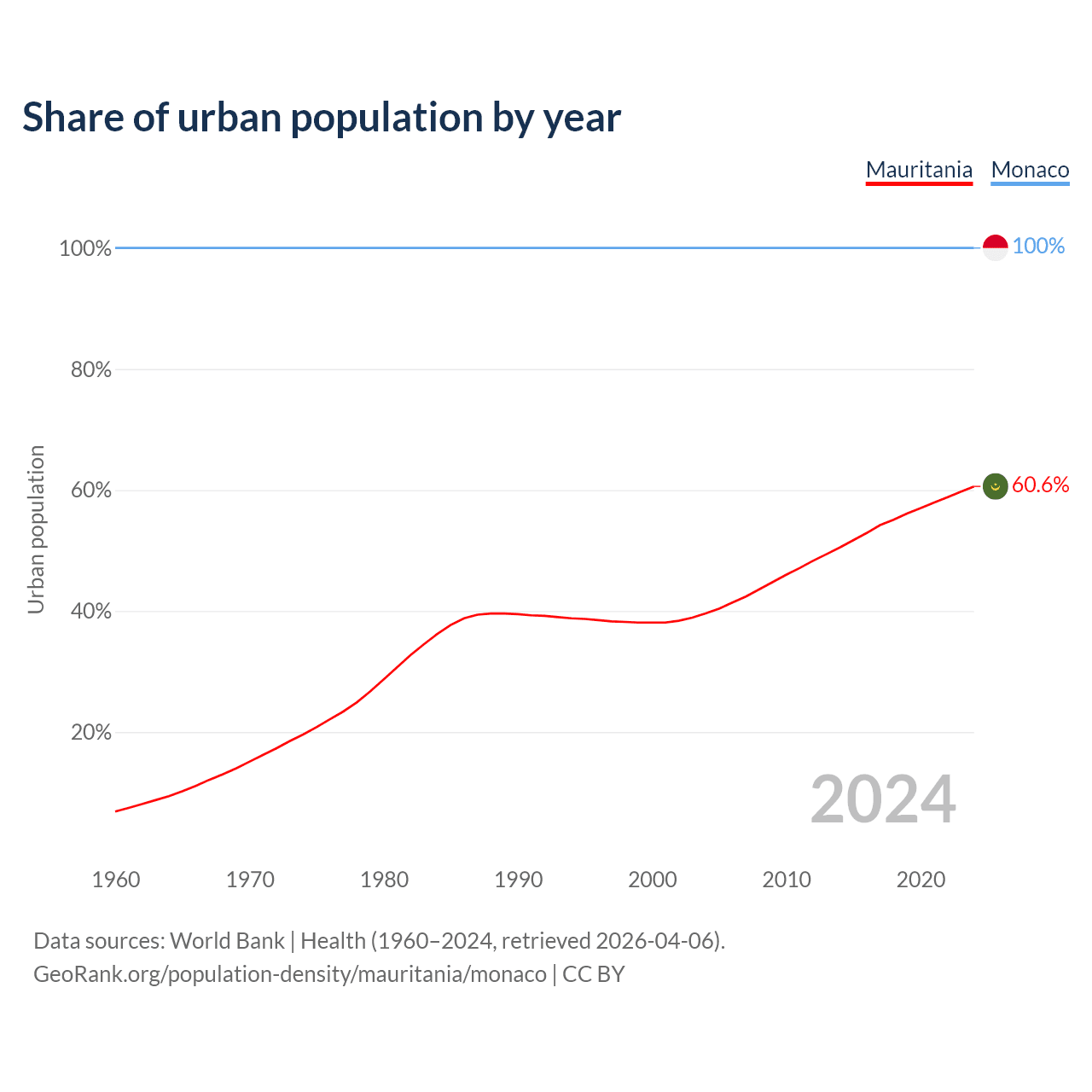 From 2004 to 2024, the share of urban population changed from 39.6% to 60.6% in Mauritania and from 100% to 100% in Monaco.