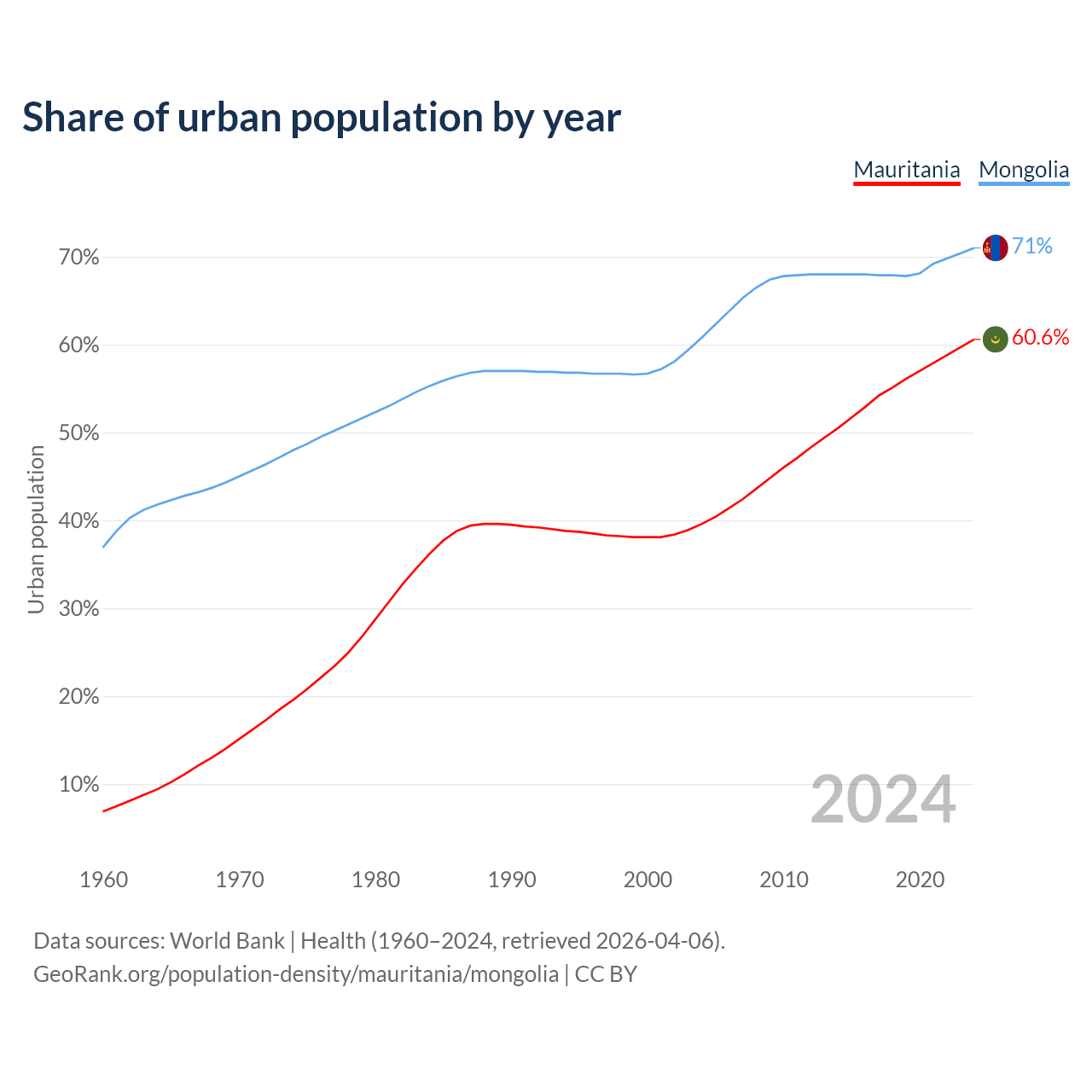 From 2004 to 2024, the share of urban population changed from 39.6% to 60.6% in Mauritania and from 60.8% to 71% in Mongolia.