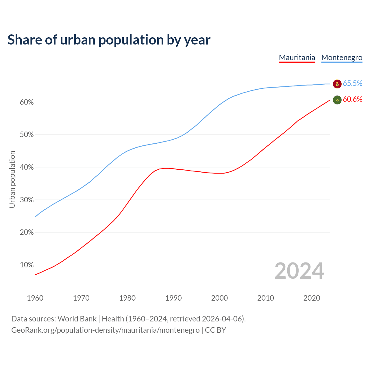 From 2004 to 2024, the share of urban population changed from 39.6% to 60.6% in Mauritania and from 62.2% to 65.5% in Montenegro.