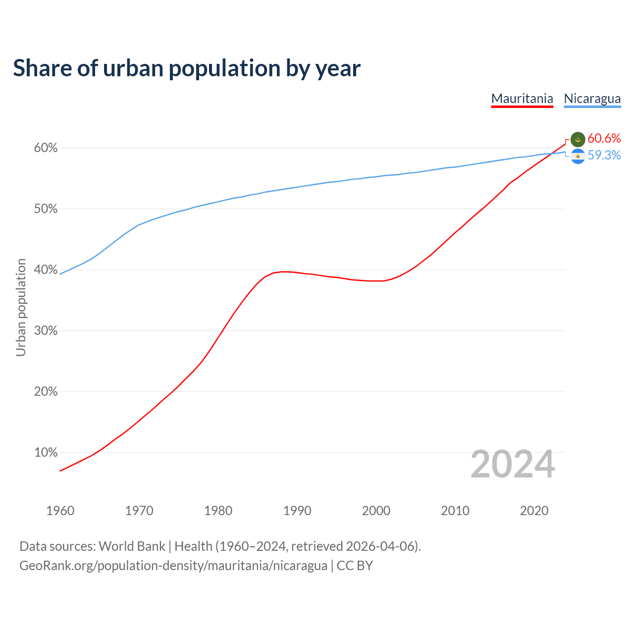 From 2004 to 2024, the share of urban population changed from 39.6% to 60.6% in Mauritania and from 55.8% to 59.3% in Nicaragua.