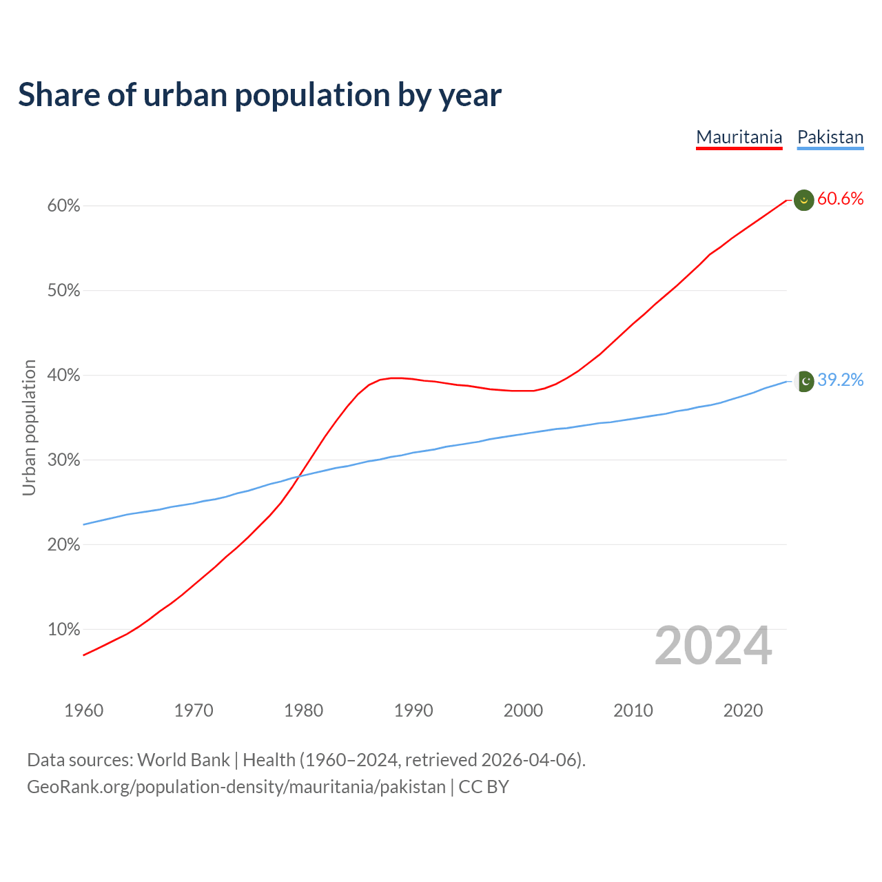 From 2004 to 2024, the share of urban population changed from 39.6% to 60.6% in Mauritania and from 33.7% to 39.2% in Pakistan.