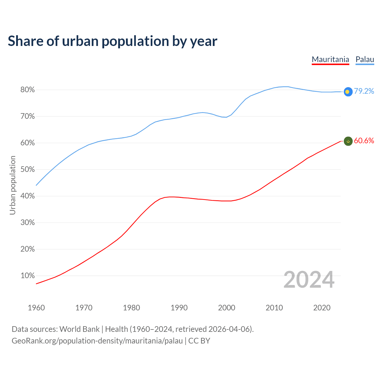 From 2004 to 2024, the share of urban population changed from 39.6% to 60.6% in Mauritania and from 76.4% to 79.2% in Palau.