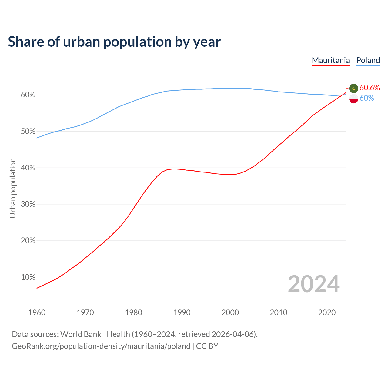 From 2004 to 2024, the share of urban population changed from 39.6% to 60.6% in Mauritania and from 61.7% to 60% in Poland.