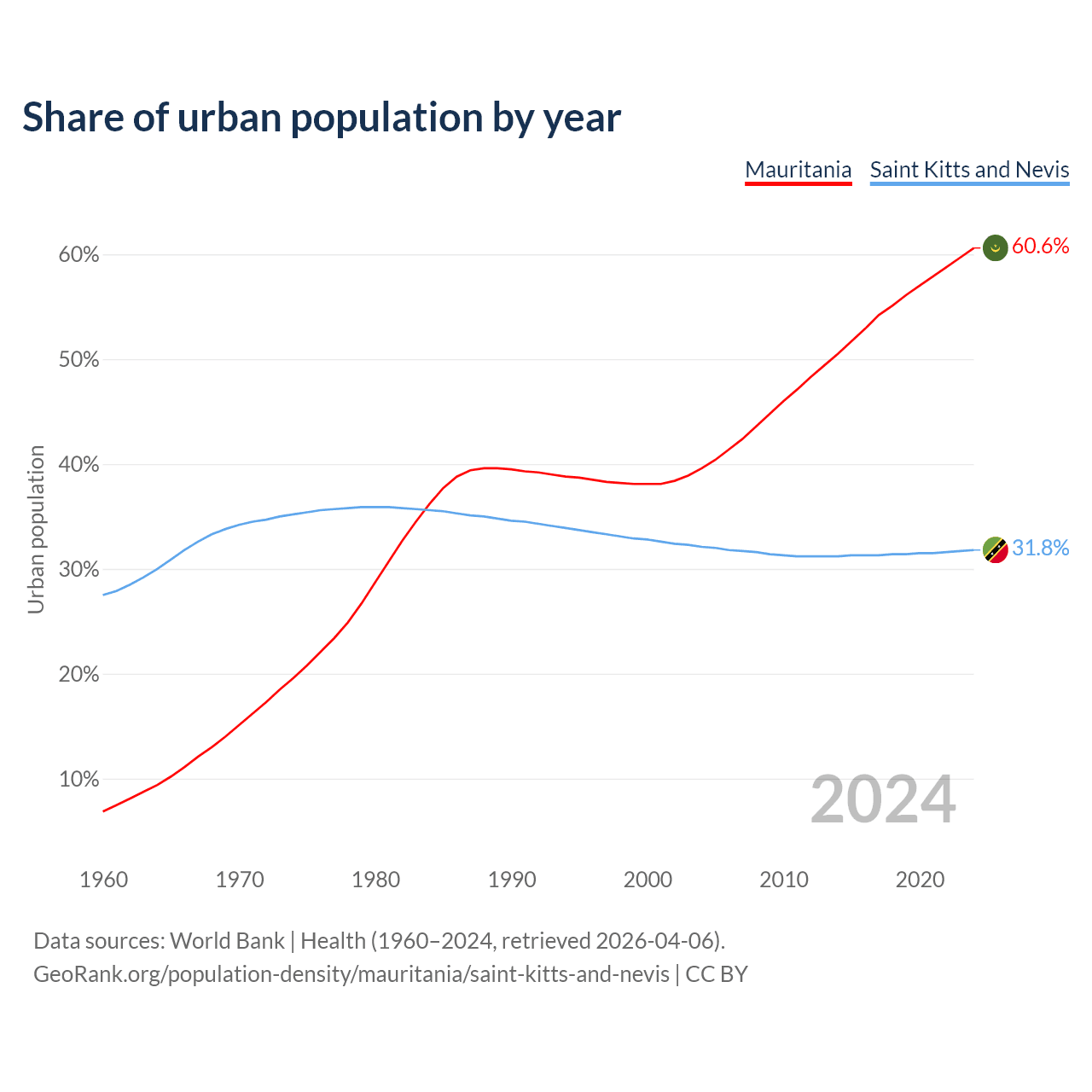 From 2004 to 2024, the share of urban population changed from 39.6% to 60.6% in Mauritania and from 32.1% to 31.8% in Saint Kitts and Nevis.
