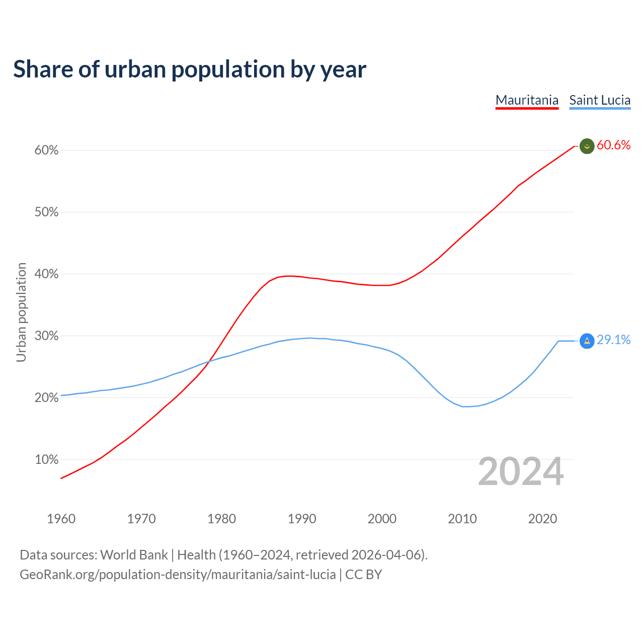 From 2004 to 2024, the share of urban population changed from 39.6% to 60.6% in Mauritania and from 24.8% to 29.1% in Saint Lucia.
