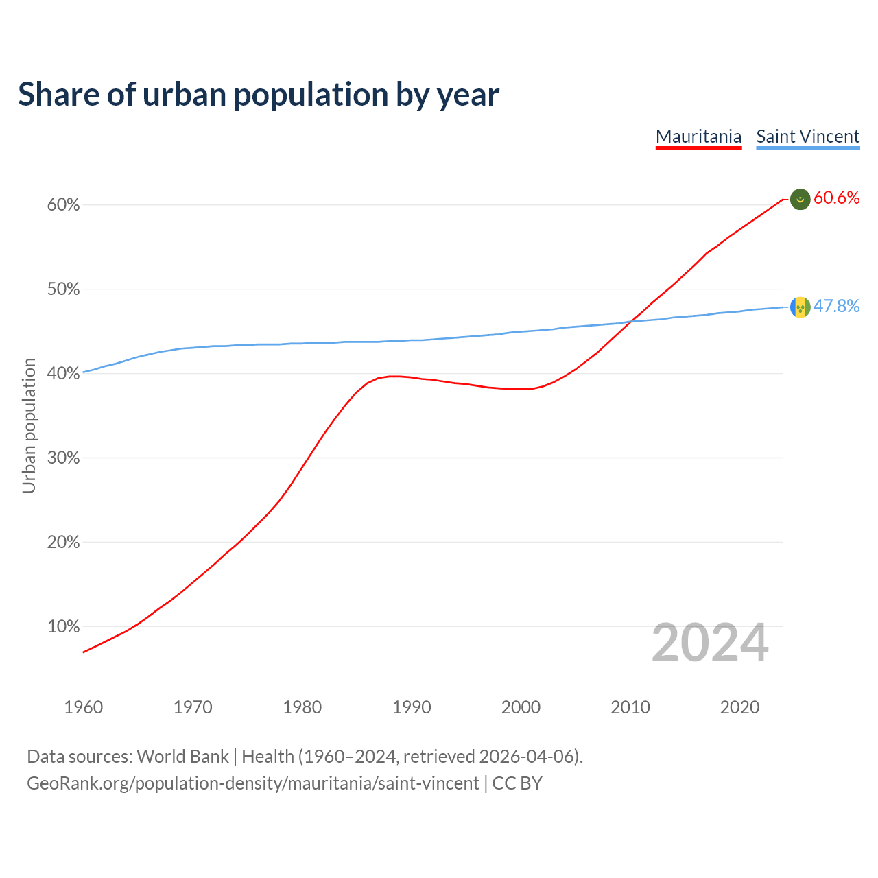 From 2004 to 2024, the share of urban population changed from 39.6% to 60.6% in Mauritania and from 45.4% to 47.8% in Saint Vincent.