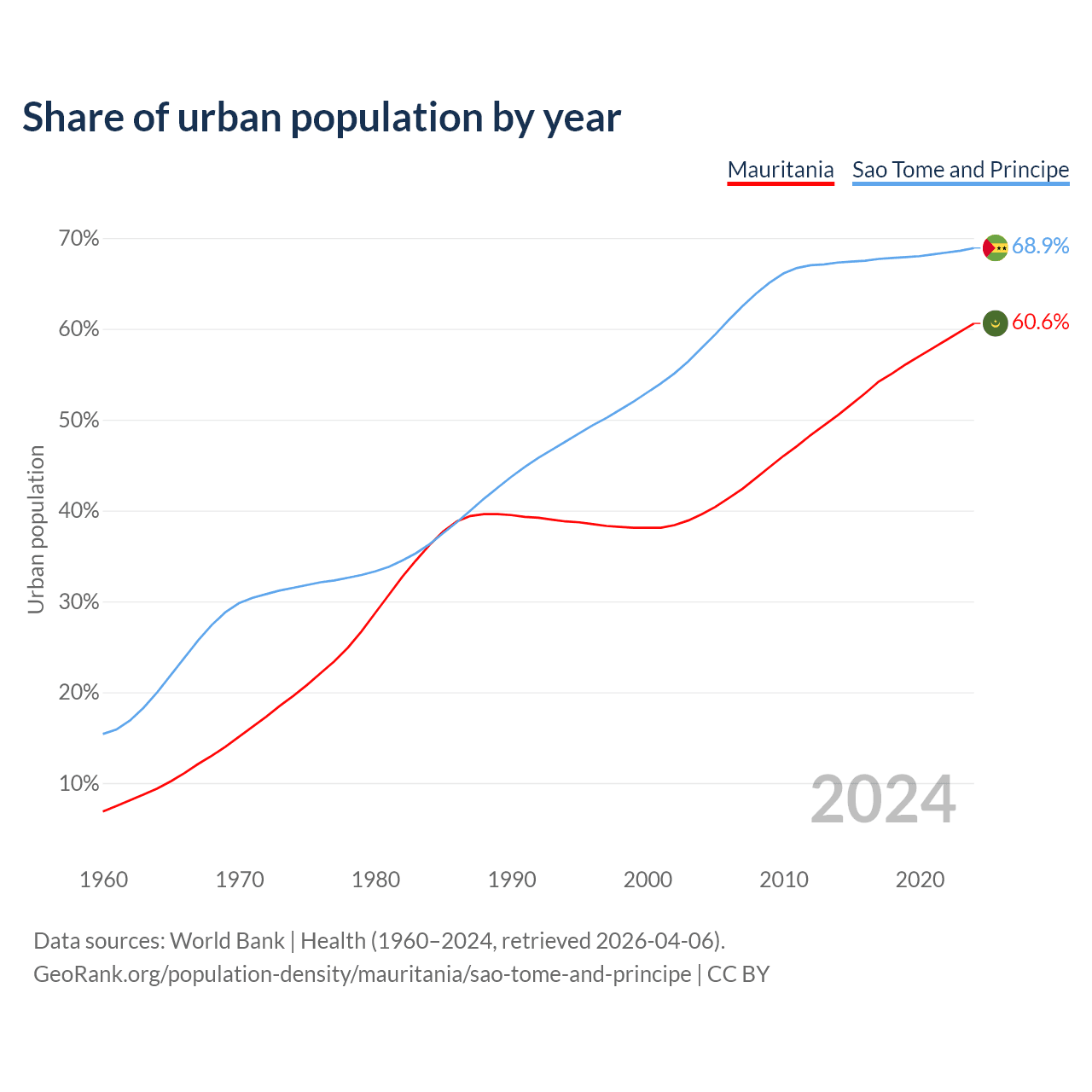 From 2004 to 2024, the share of urban population changed from 39.6% to 60.6% in Mauritania and from 57.9% to 68.9% in Sao Tome and Principe.