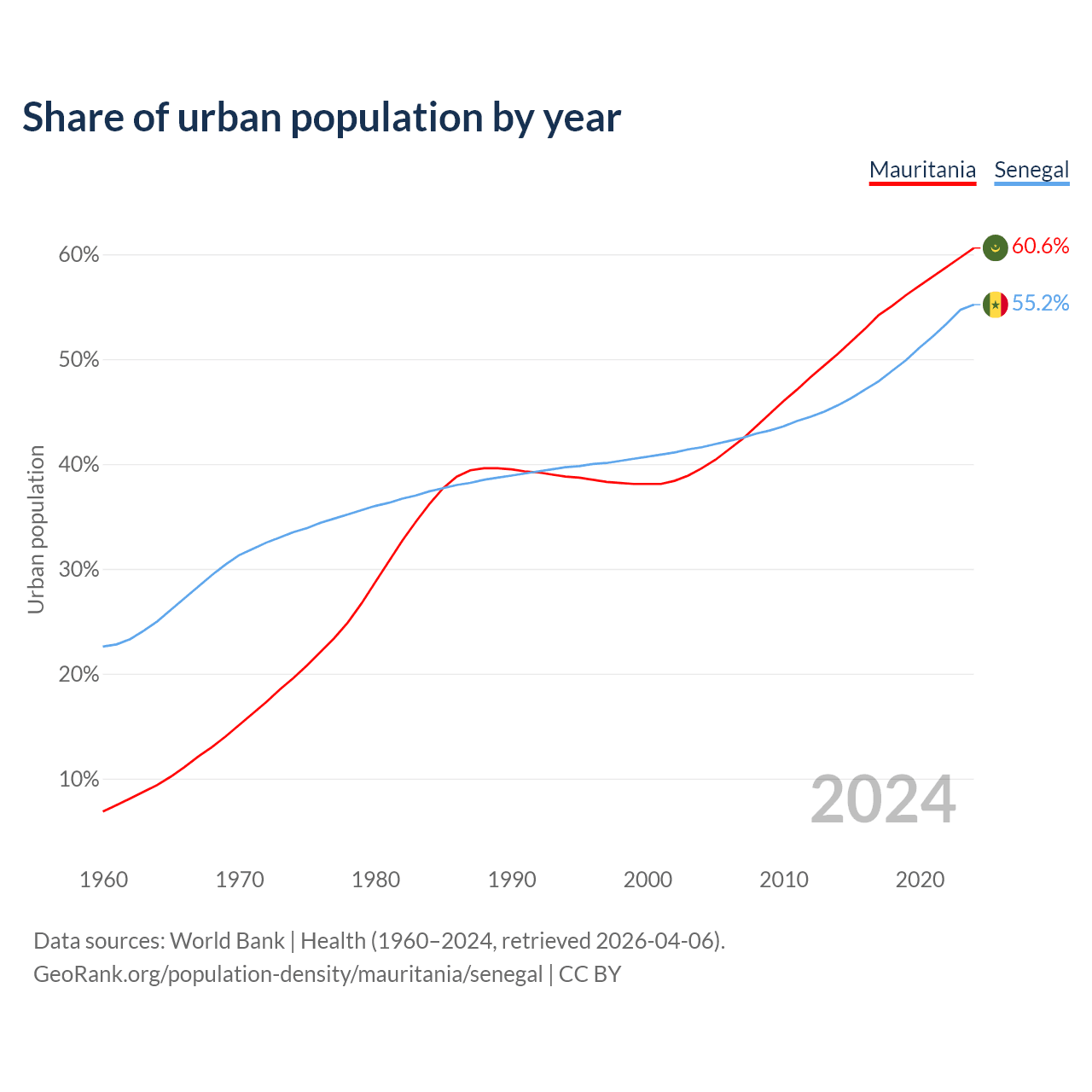 From 2004 to 2024, the share of urban population changed from 39.6% to 60.6% in Mauritania and from 41.6% to 55.2% in Senegal.