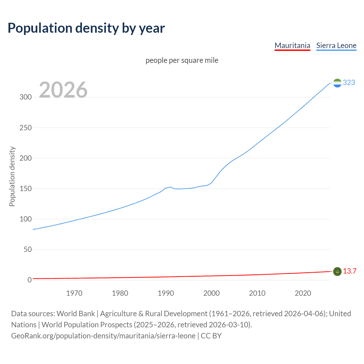 From 2006 to 2026, population density in Mauritania increased by 81.3%, compared to a 60% growth in Sierra Leone.
