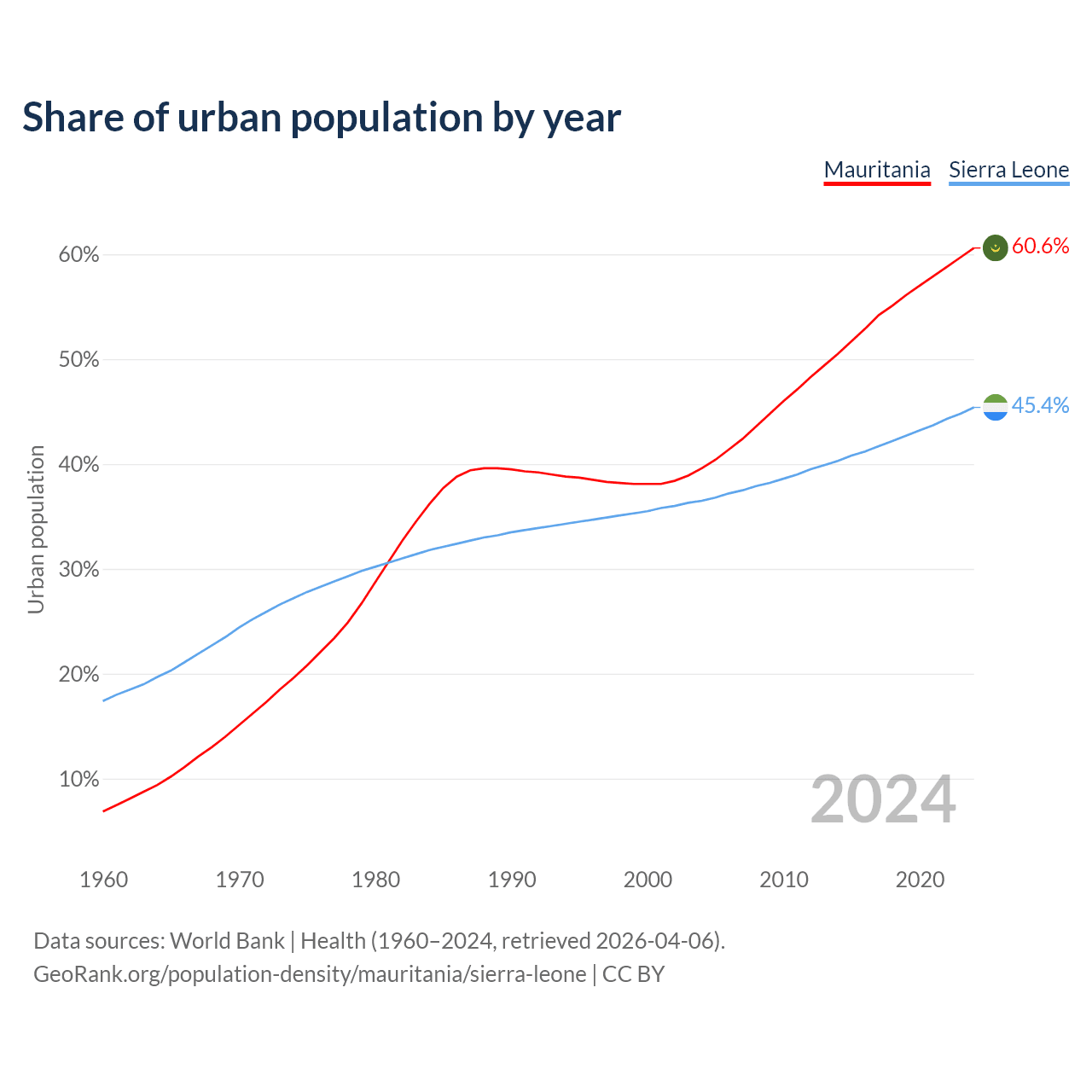 From 2004 to 2024, the share of urban population changed from 39.6% to 60.6% in Mauritania and from 36.5% to 45.4% in Sierra Leone.