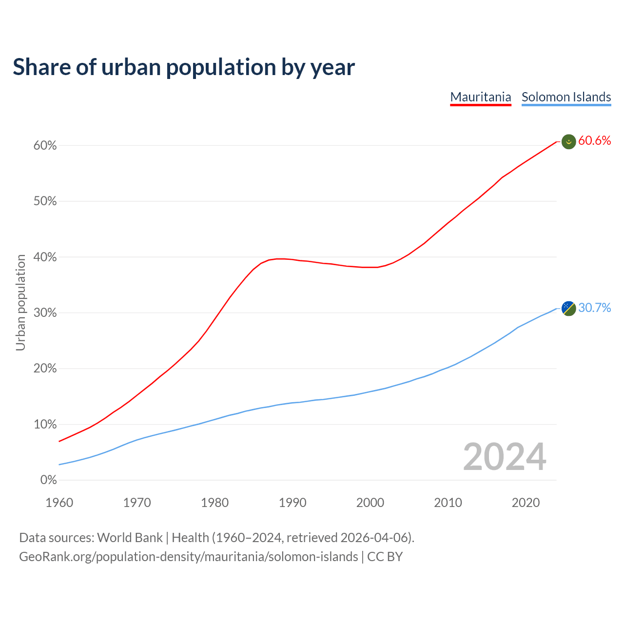 From 2004 to 2024, the share of urban population changed from 39.6% to 60.6% in Mauritania and from 17.2% to 30.7% in the Solomon Islands.