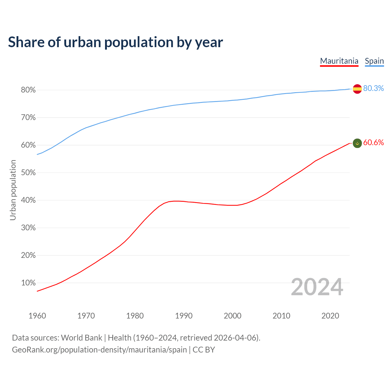 From 2004 to 2024, the share of urban population changed from 39.6% to 60.6% in Mauritania and from 77% to 80.3% in Spain.