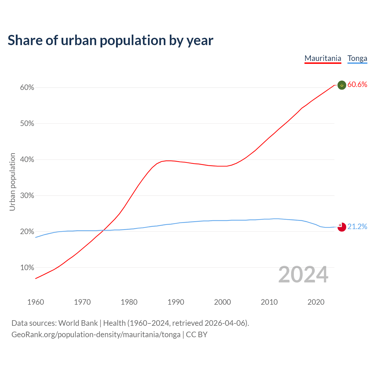 From 2004 to 2024, the share of urban population changed from 39.6% to 60.6% in Mauritania and from 23.1% to 21.2% in Tonga.