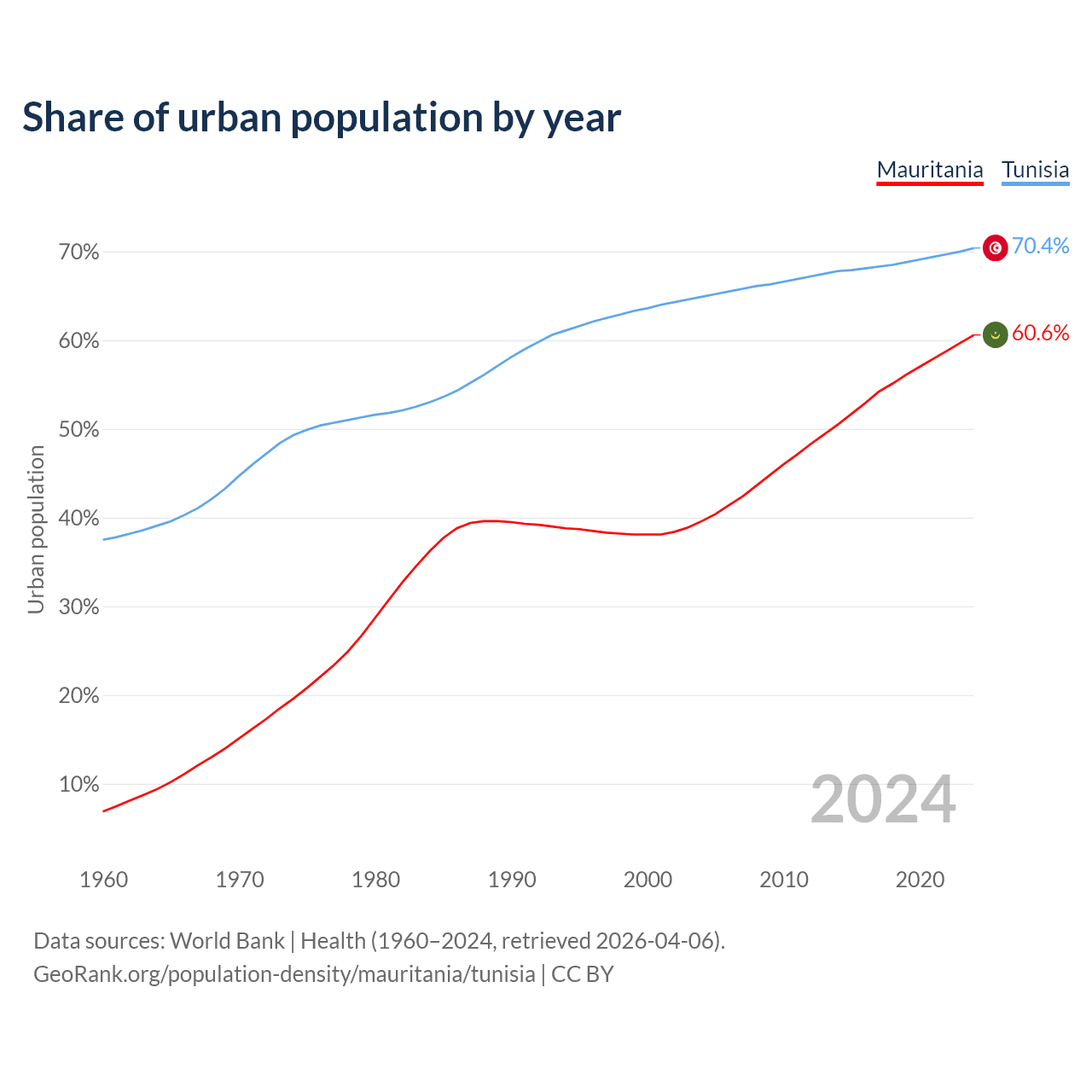 From 2004 to 2024, the share of urban population changed from 39.6% to 60.6% in Mauritania and from 64.9% to 70.4% in Tunisia.
