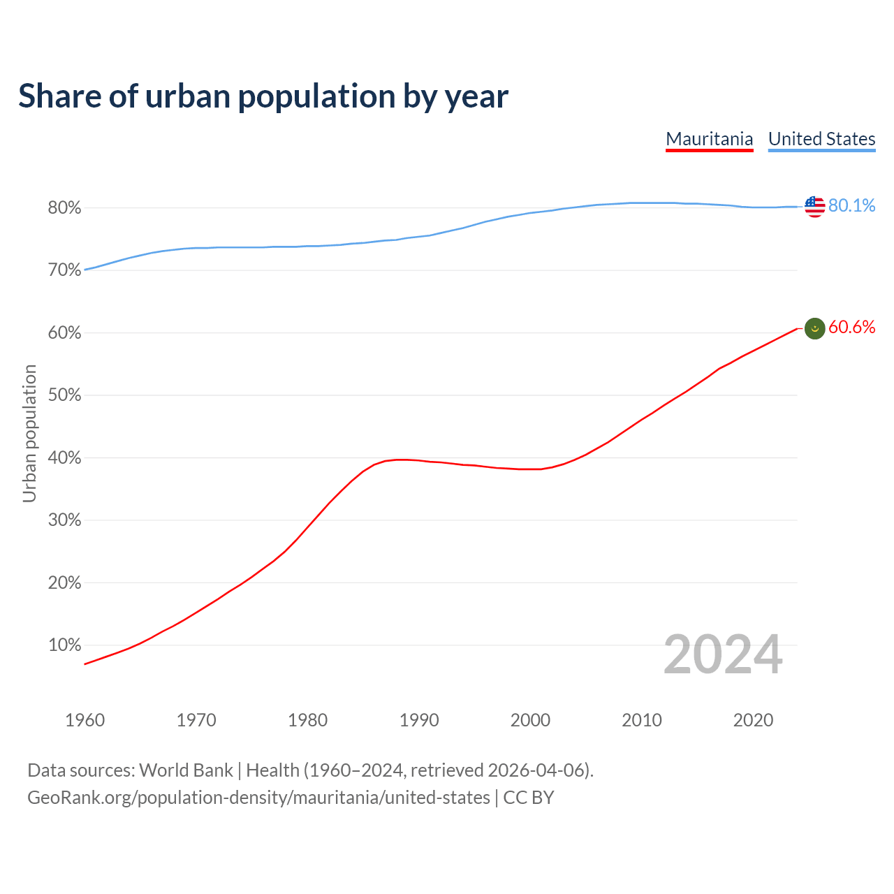 From 2004 to 2024, the share of urban population changed from 39.6% to 60.6% in Mauritania and from 80% to 80.1% in the United States.