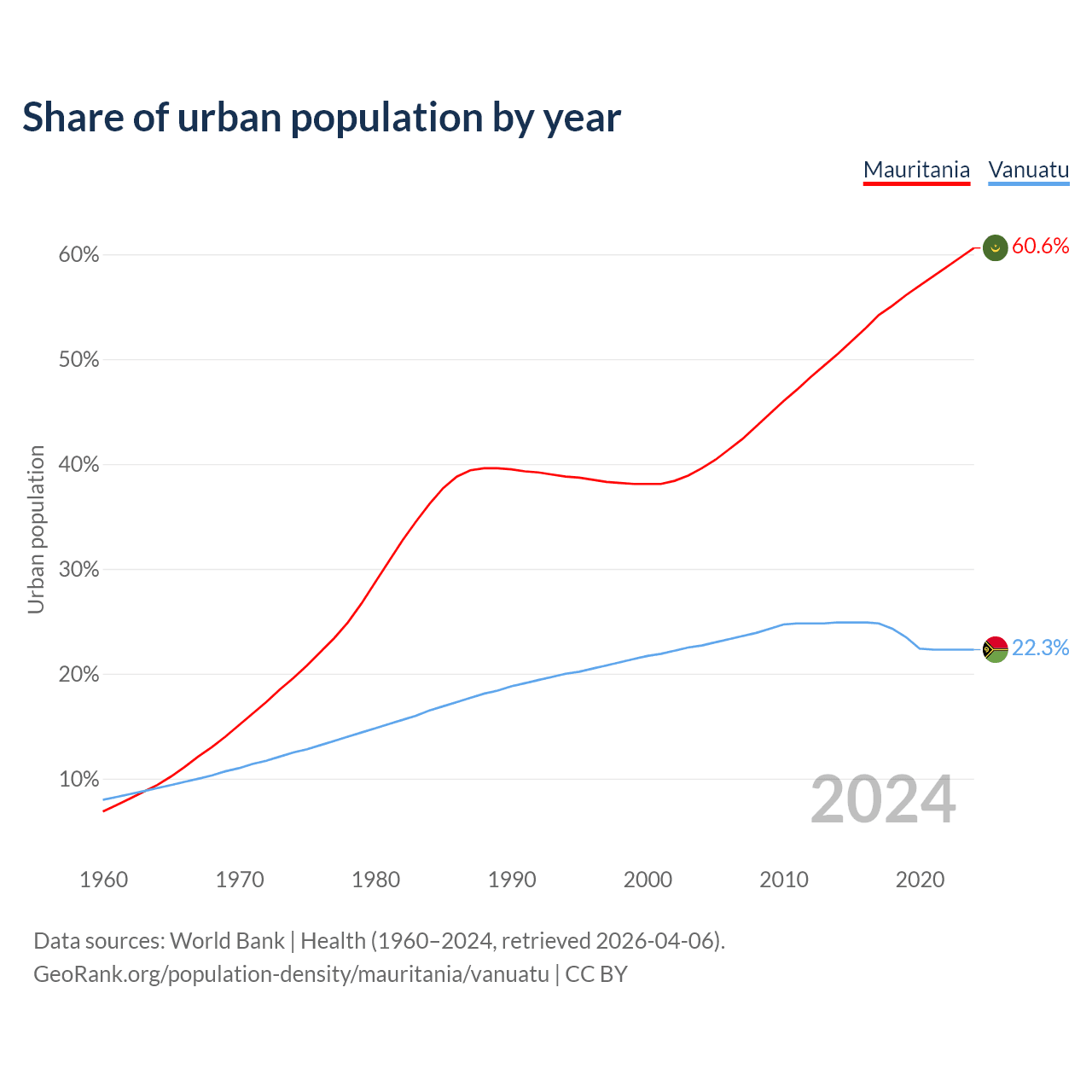 From 2004 to 2024, the share of urban population changed from 39.6% to 60.6% in Mauritania and from 22.7% to 22.3% in Vanuatu.