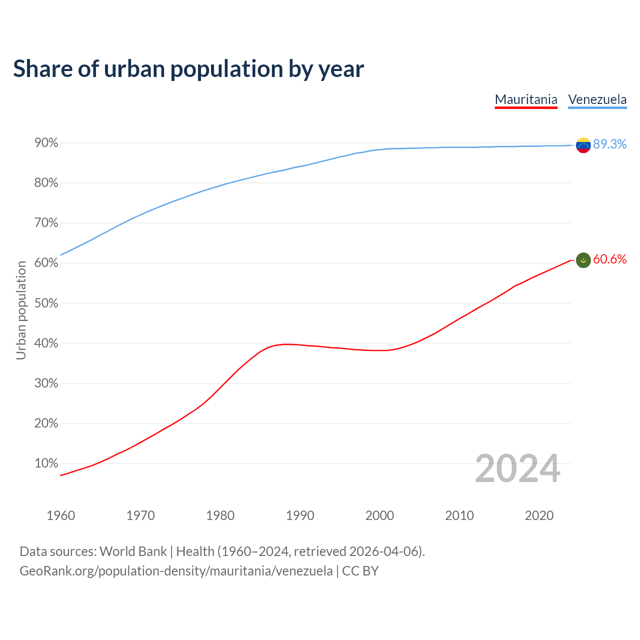From 2004 to 2024, the share of urban population changed from 39.6% to 60.6% in Mauritania and from 88.6% to 89.3% in Venezuela.