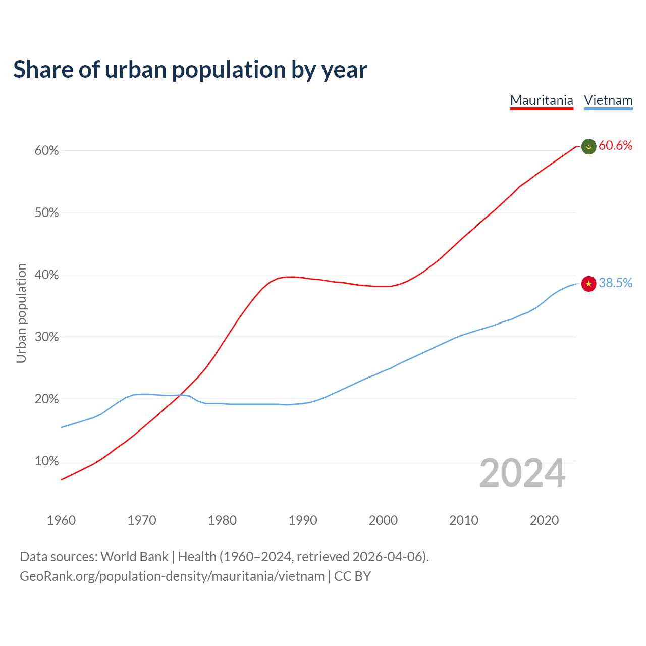 From 2004 to 2024, the share of urban population changed from 39.6% to 60.6% in Mauritania and from 26.8% to 38.5% in Vietnam.