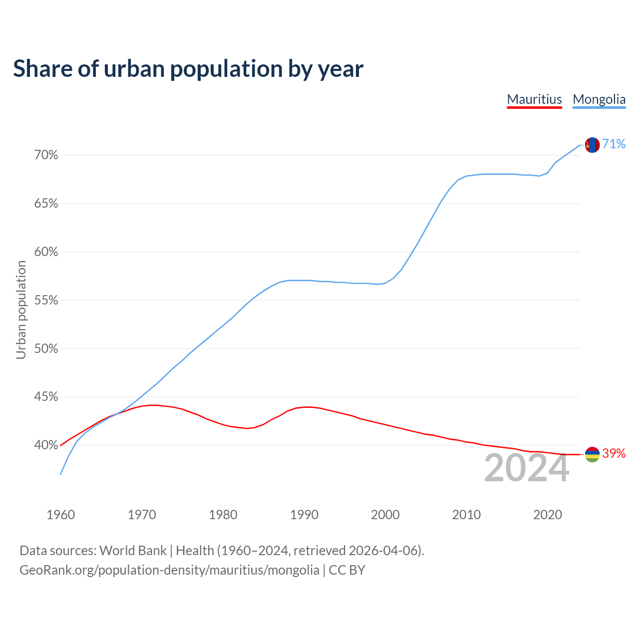 From 2004 to 2024, the share of urban population changed from 41.3% to 39% in Mauritius and from 60.8% to 71% in Mongolia.