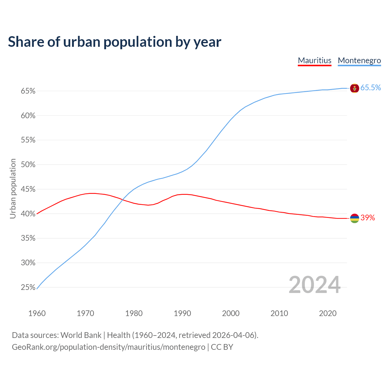 From 2004 to 2024, the share of urban population changed from 41.3% to 39% in Mauritius and from 62.2% to 65.5% in Montenegro.