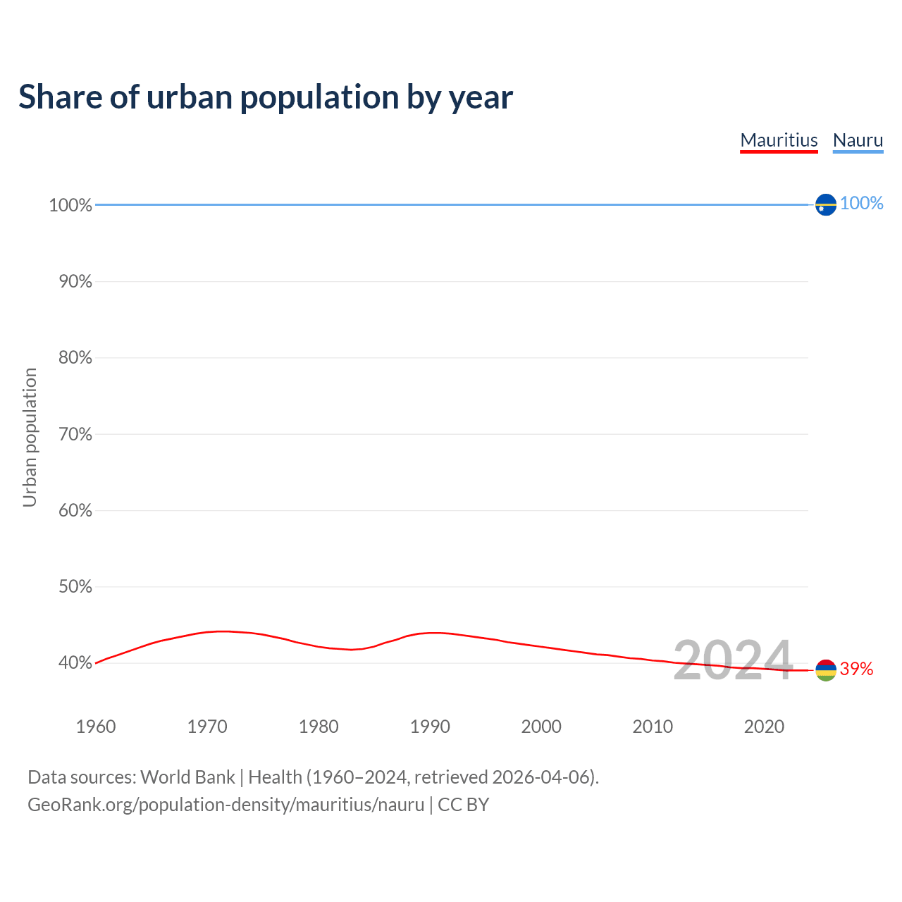 From 2004 to 2024, the share of urban population changed from 41.3% to 39% in Mauritius and from 100% to 100% in Nauru.