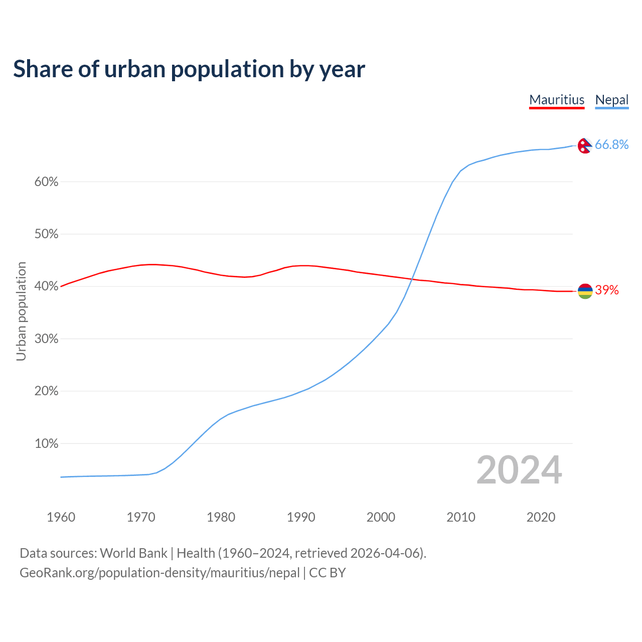 From 2004 to 2024, the share of urban population changed from 41.3% to 39% in Mauritius and from 41.6% to 66.8% in Nepal.