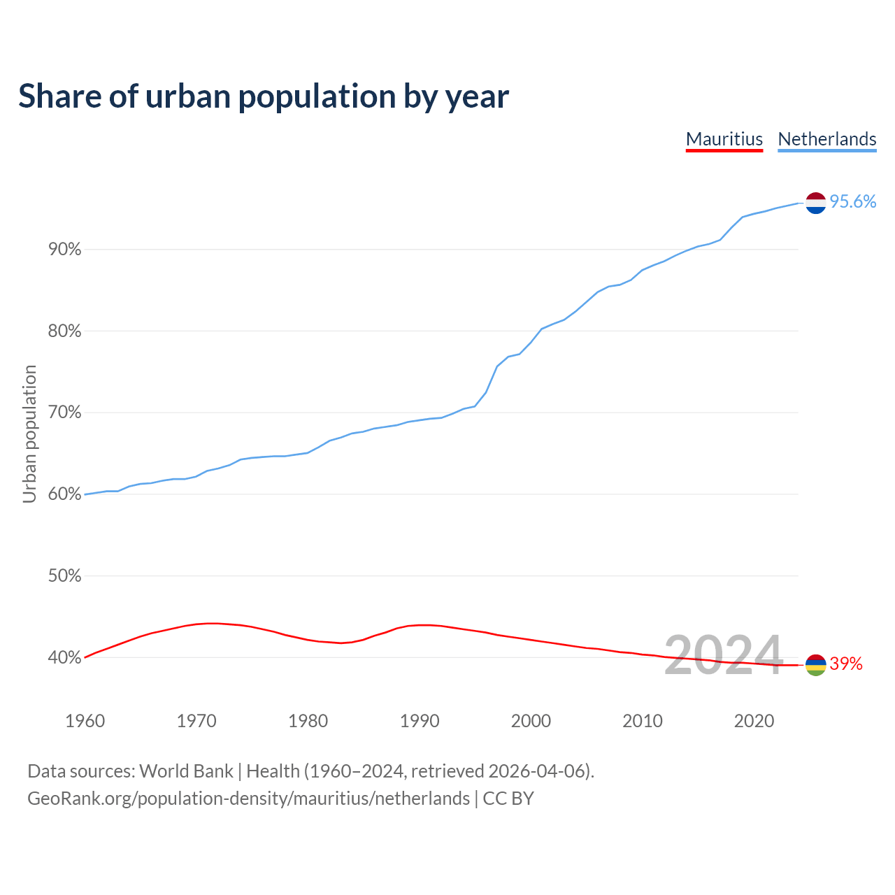 From 2006 to 2026, population density in Mauritius increased by 2.16%, compared to a 11.8% growth in the Netherlands.