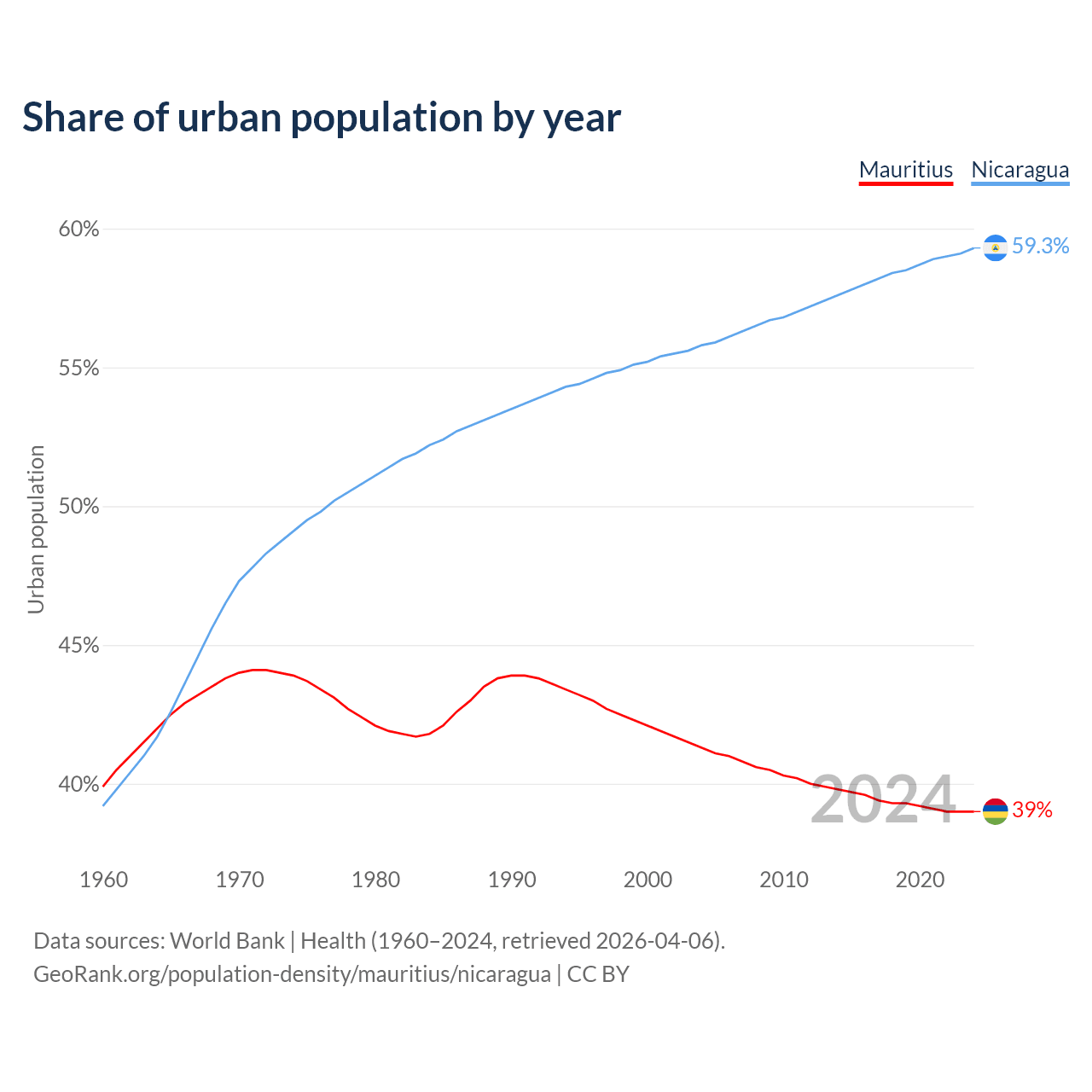 From 2004 to 2024, the share of urban population changed from 41.3% to 39% in Mauritius and from 55.8% to 59.3% in Nicaragua.