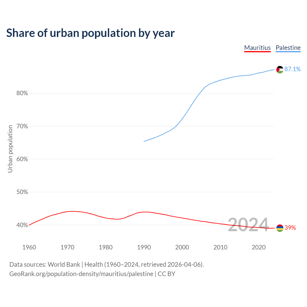 From 2004 to 2024, the share of urban population changed from 41.3% to 39% in Mauritius and from 79% to 87.1% in Palestine.