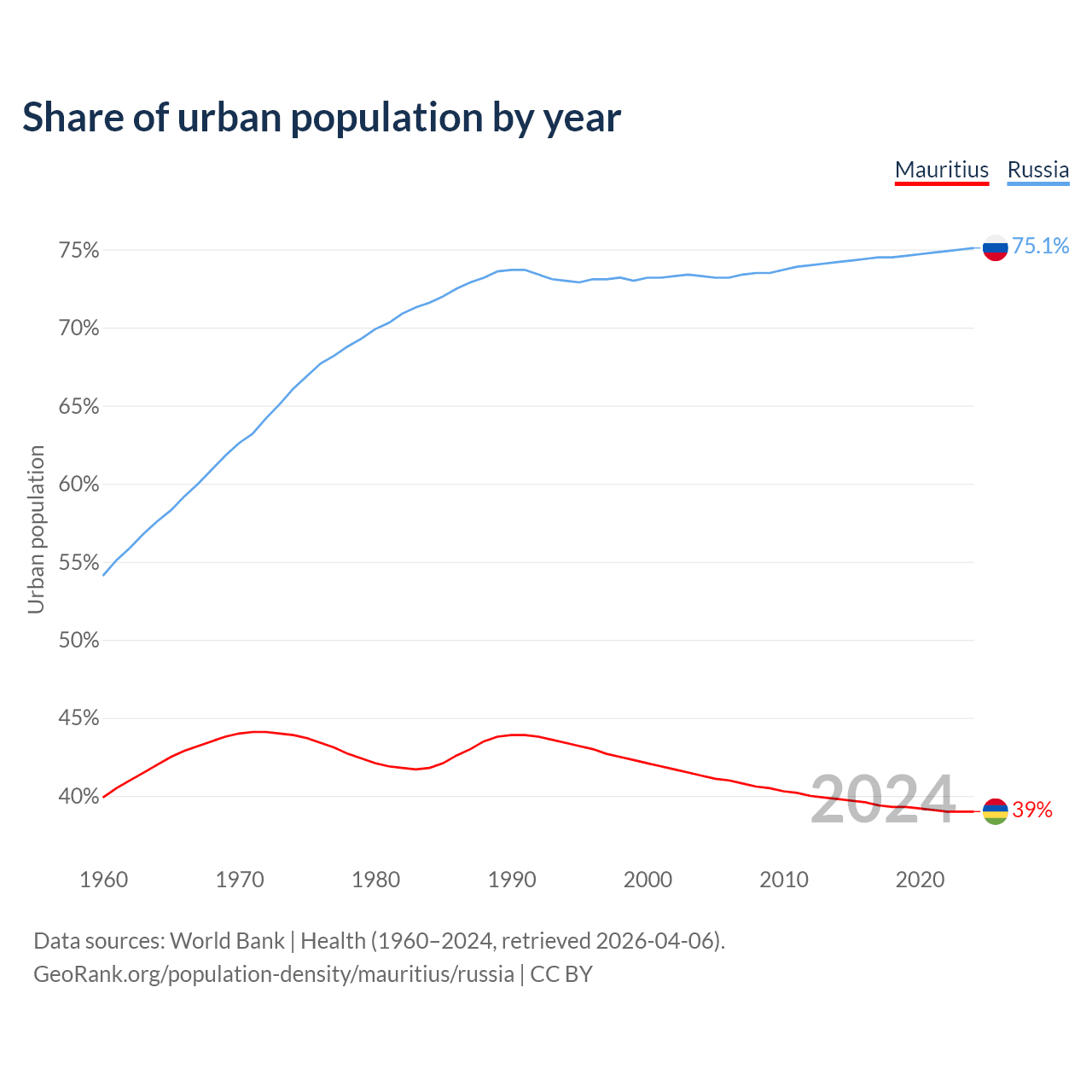 From 2004 to 2024, the share of urban population changed from 41.3% to 39% in Mauritius and from 73.3% to 75.1% in Russia.