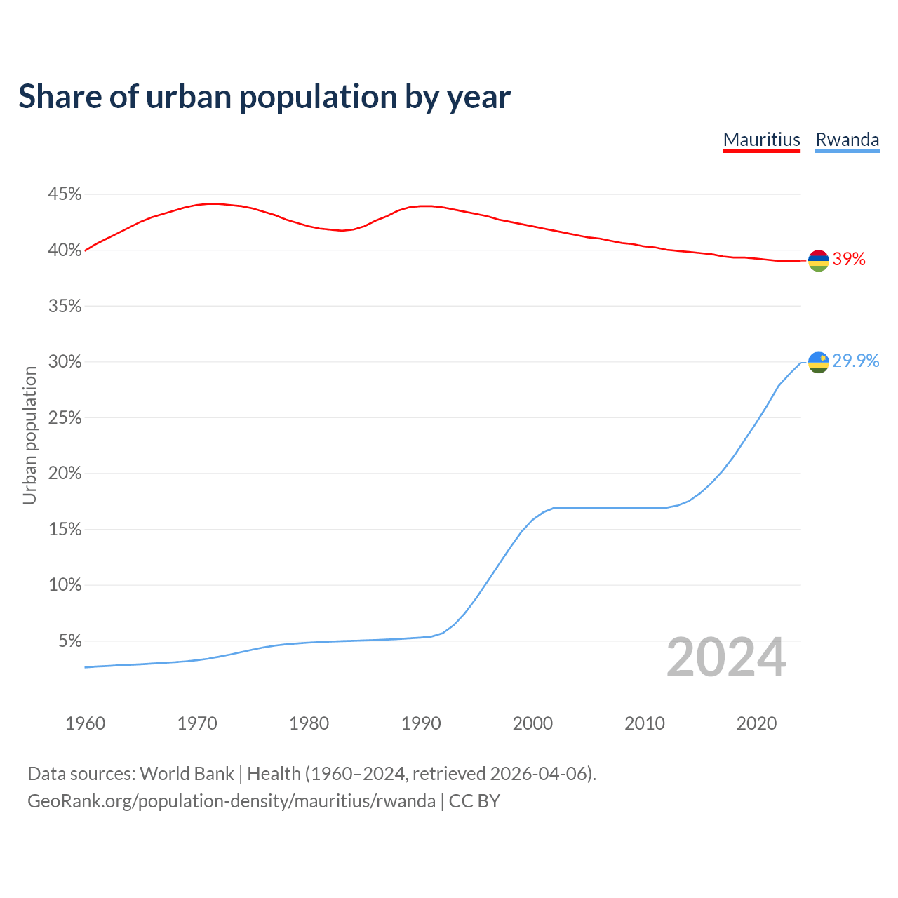 From 2006 to 2026, population density in Mauritius increased by 2.16%, compared to a 60.1% growth in Rwanda.