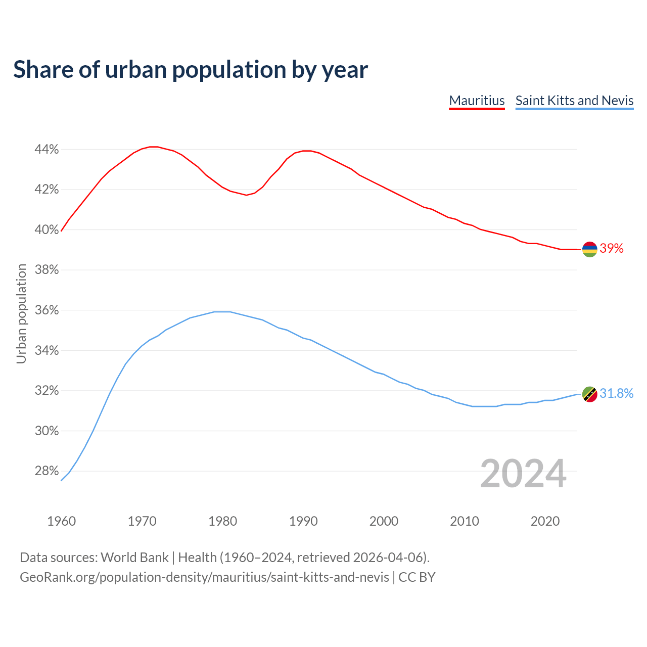From 2004 to 2024, the share of urban population changed from 41.3% to 39% in Mauritius and from 32.1% to 31.8% in Saint Kitts and Nevis.