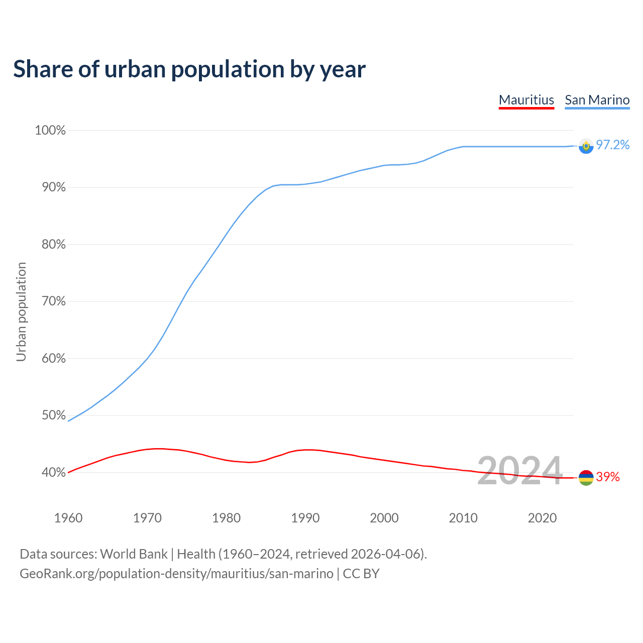 From 2004 to 2024, the share of urban population changed from 41.3% to 39% in Mauritius and from 94.2% to 97.2% in San Marino.