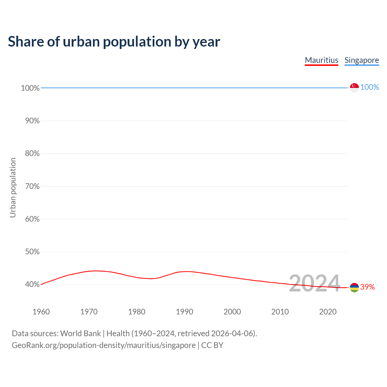 From 2004 to 2024, the share of urban population changed from 41.3% to 39% in Mauritius and from 100% to 100% in Singapore.