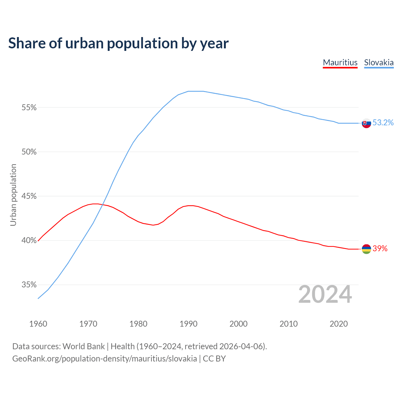 From 2004 to 2024, the share of urban population changed from 41.3% to 39% in Mauritius and from 55.6% to 53.2% in Slovakia.
