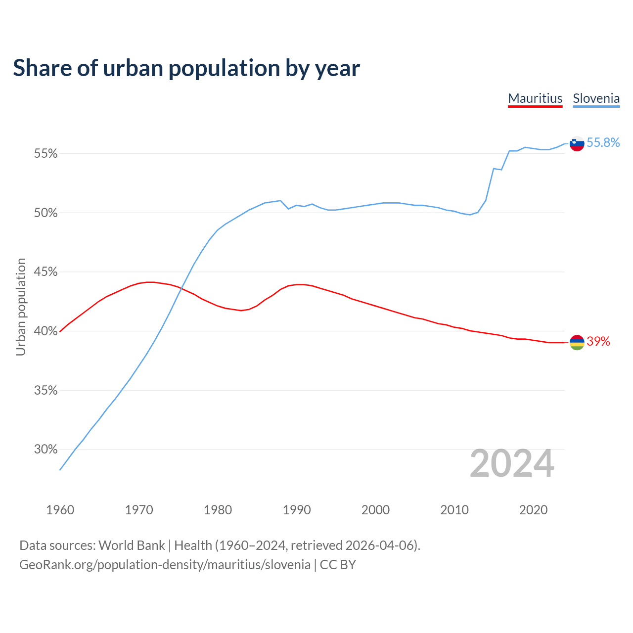 From 2004 to 2024, the share of urban population changed from 41.3% to 39% in Mauritius and from 50.7% to 55.8% in Slovenia.