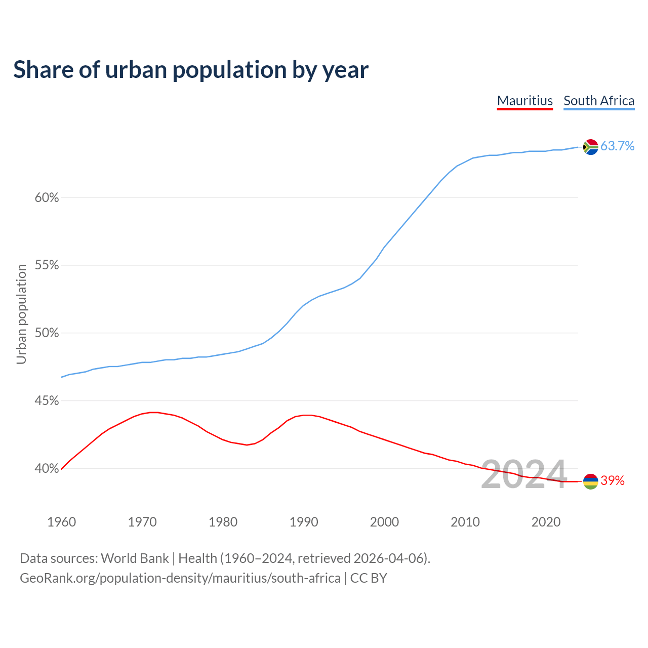 From 2004 to 2024, the share of urban population changed from 41.3% to 39% in Mauritius and from 59.1% to 63.7% in South Africa.