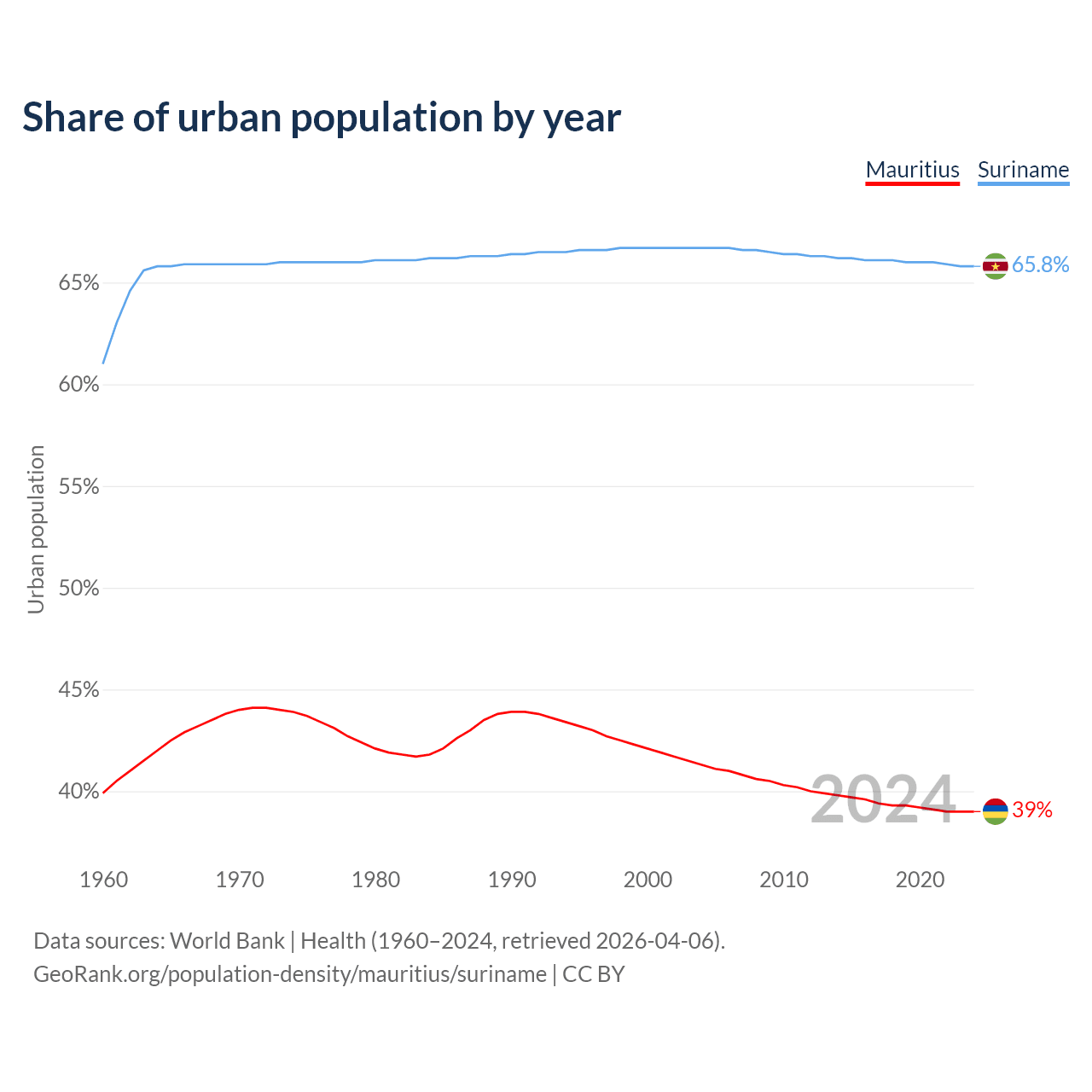 From 2004 to 2024, the share of urban population changed from 41.3% to 39% in Mauritius and from 66.7% to 65.8% in Suriname.