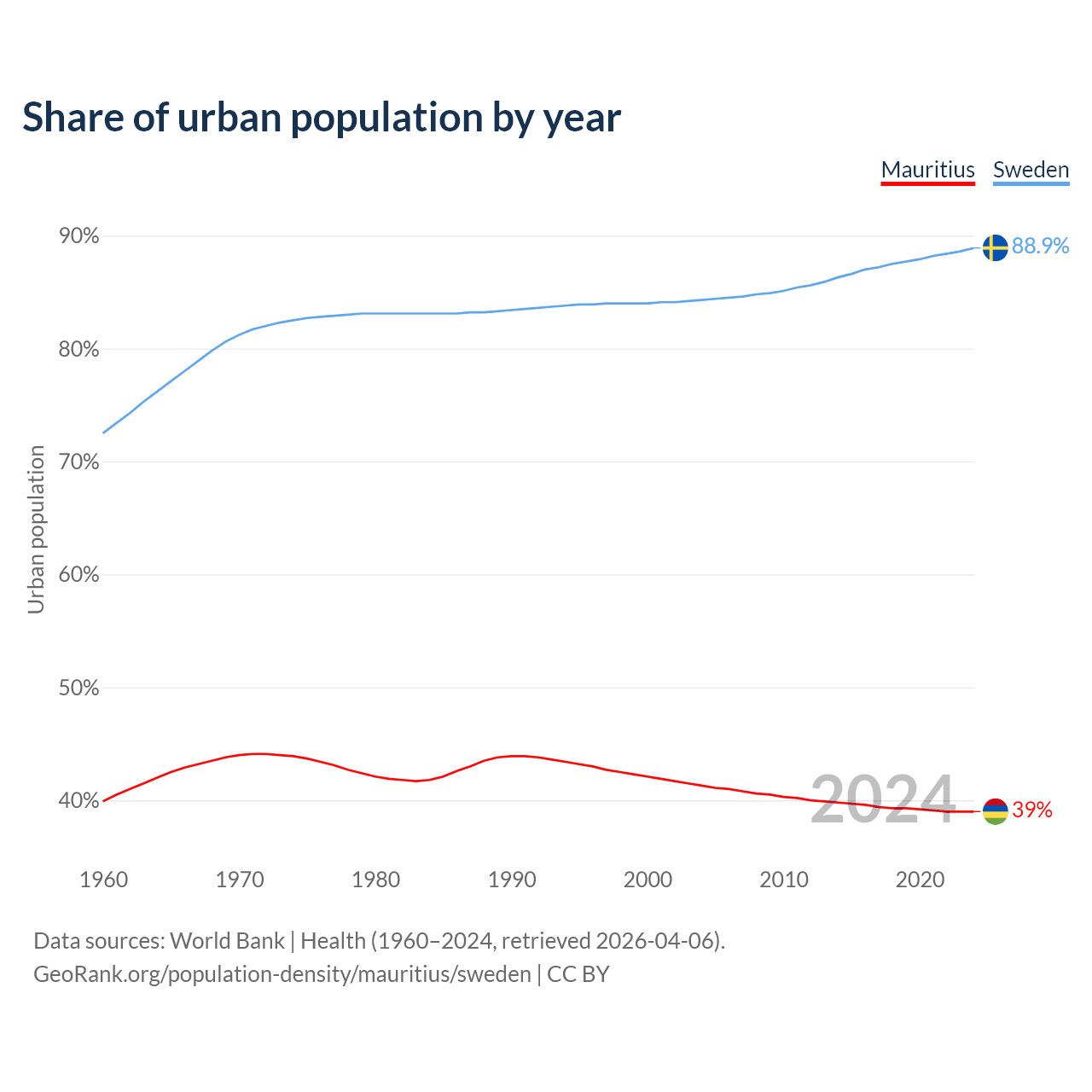 From 2004 to 2024, the share of urban population changed from 41.3% to 39% in Mauritius and from 84.3% to 88.9% in Sweden.