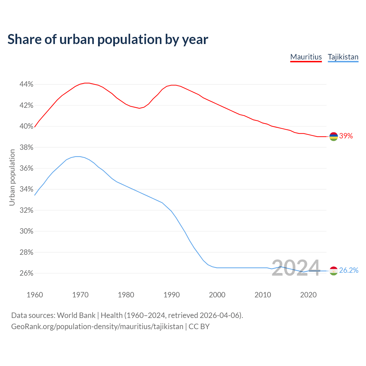 From 2004 to 2024, the share of urban population changed from 41.3% to 39% in Mauritius and from 26.5% to 26.2% in Tajikistan.