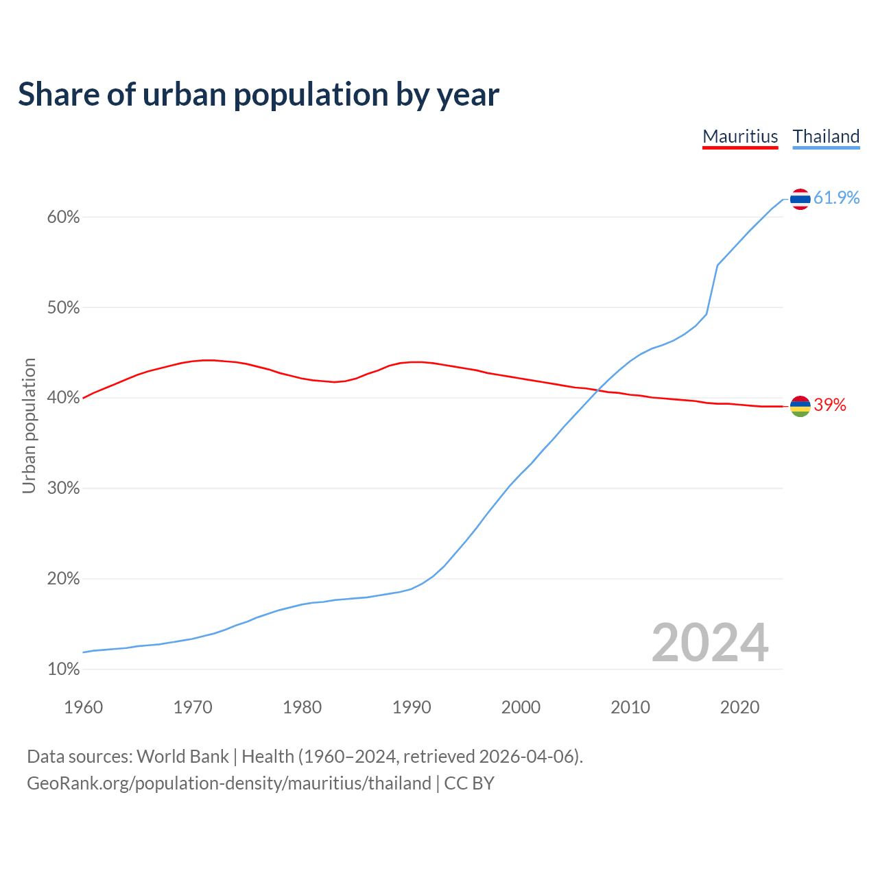 From 2004 to 2024, the share of urban population changed from 41.3% to 39% in Mauritius and from 36.8% to 61.9% in Thailand.