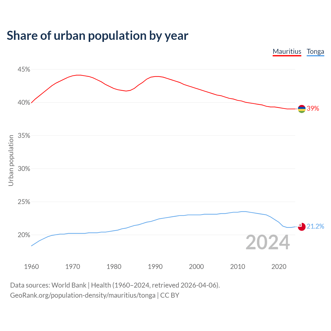 From 2004 to 2024, the share of urban population changed from 41.3% to 39% in Mauritius and from 23.1% to 21.2% in Tonga.