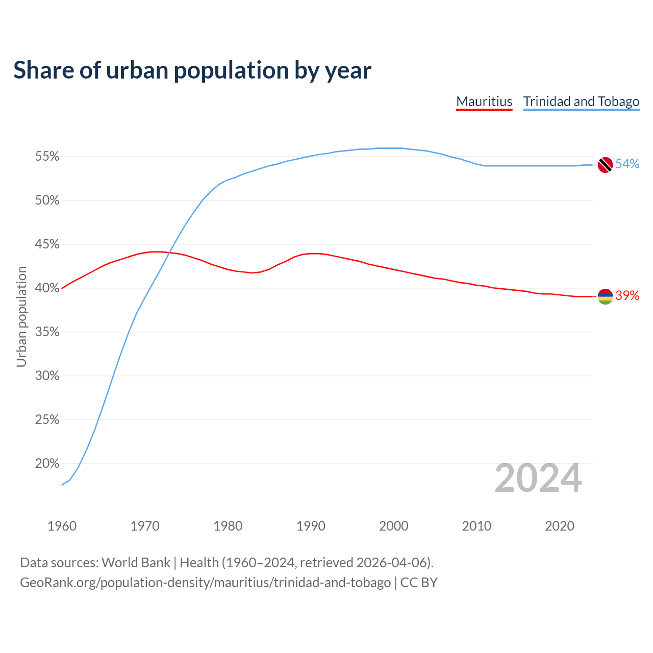 From 2004 to 2024, the share of urban population changed from 41.3% to 39% in Mauritius and from 55.6% to 54% in Trinidad and Tobago.