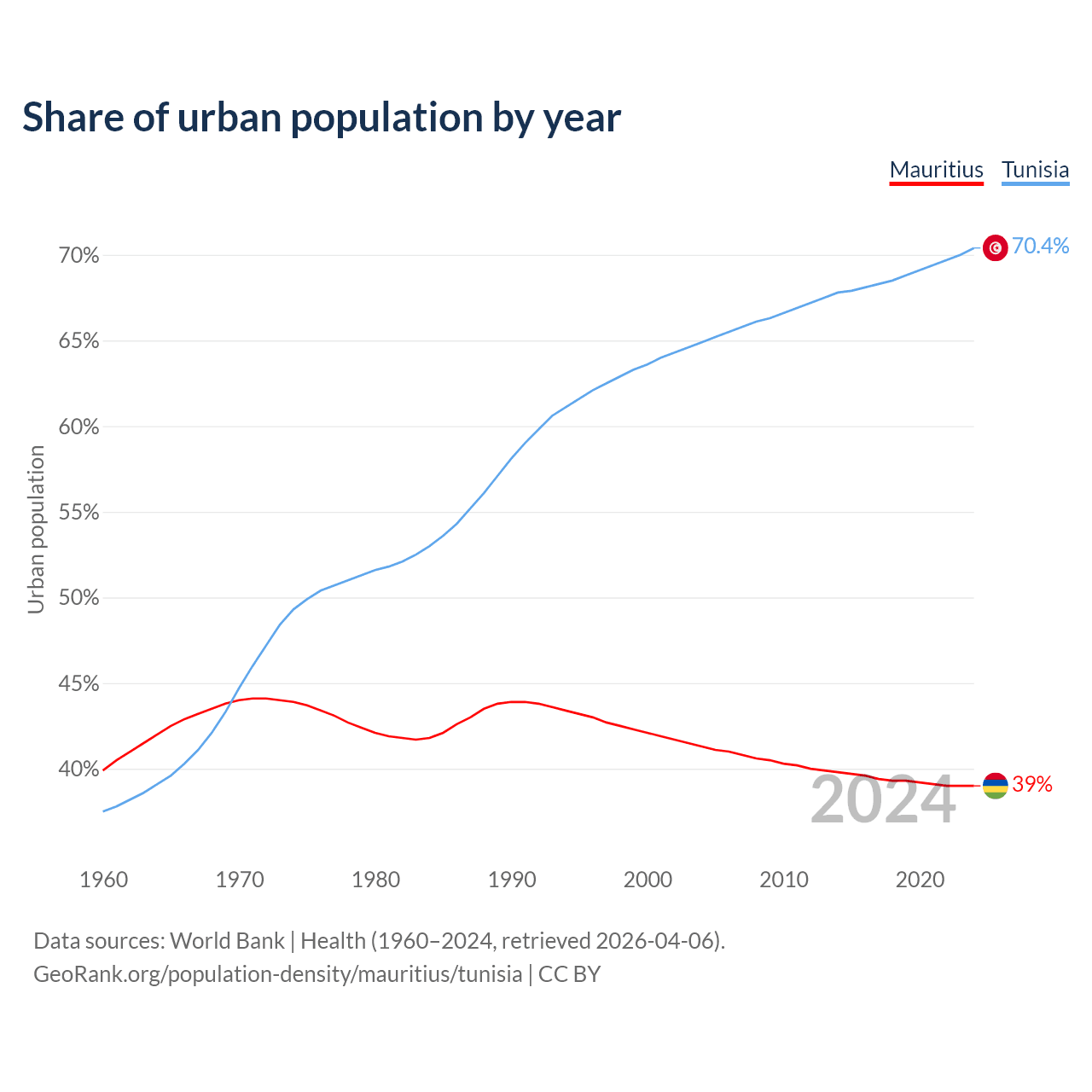 From 2004 to 2024, the share of urban population changed from 41.3% to 39% in Mauritius and from 64.9% to 70.4% in Tunisia.